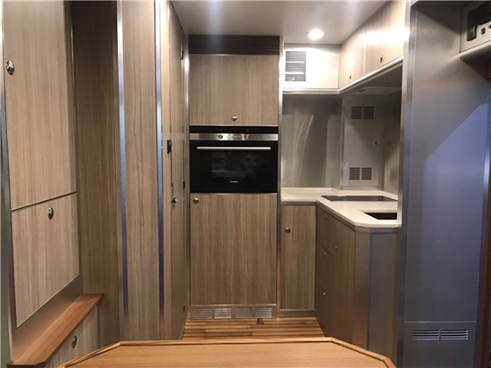 重汽汕斯特改装越野房车厨房一角:顶部配有吸油烟机,保证我们做饭时不会影响车内的休息空间。电磁炉,洗菜池,微波炉,储物格。