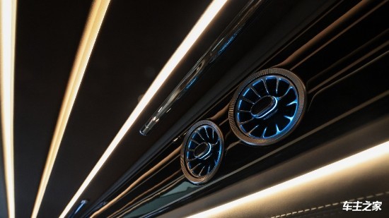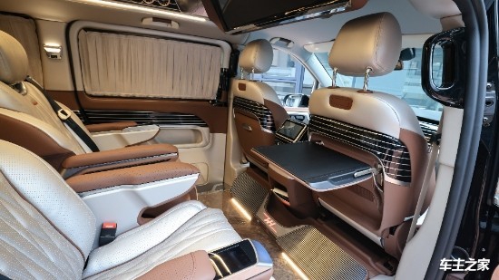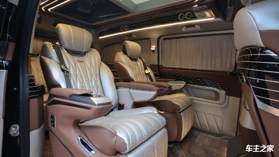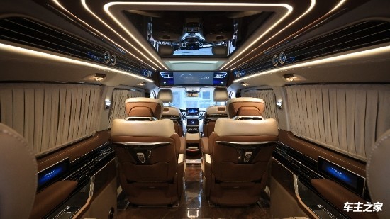 这款奔驰v260七座商务车内部淡黄系的顶灯周围都是顶级的翻毛皮包裹,大量钢琴烤漆取材,做工也相当细腻;拉上私密窗帘,打开车顶的灯池、廊灯还有出风口、地板的氛围灯,营造出的完全是明亮宽敞的头等舱感受。