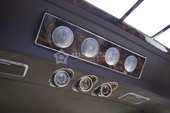 后舱新款侧壁,模具化生产组成,前方三块克蒂定制马祖表,时间、温度、湿度;全车配备电动窗帘,一键开启,一键关闭。还配备车载智能新风系统,自动换气,保证空气清新。