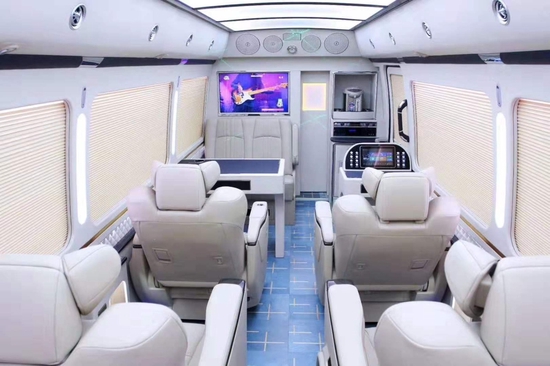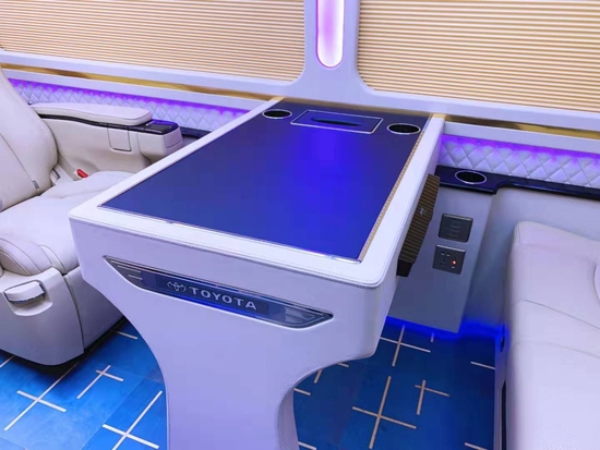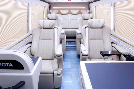 丰田 柯斯达 旨在为顾客打造佳移动办公环境,经济性、豪华性以及整车性能的综合匹配,构成了COASTER 众多受欢迎的特点, 丰田 考斯特 内部可配备豪华电动窗帘:窗帘面料阻燃、隔热、隔光、隔音;侧壁更换蒙皮:侧壁更换意大利进口真皮,手感舒适,侧壁菱形格的设计使整车层次分明立体感更强。