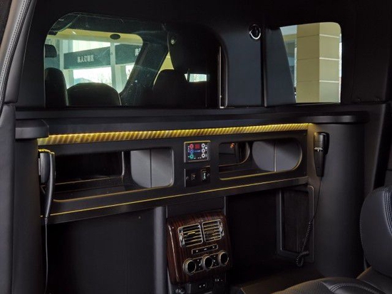 路虎揽胜 (配置|询价)皇家一号加长版前方座椅加热带按摩功能,车载冰箱一应俱全,由于车比较长,所以配备了前后对讲功能。车内配有一个类似于KTV似的吧台,带蓝光SONY牌DVD,索尼高清LED电视,以色列卫星天线,以及空气净化器,车内带氛围灯。