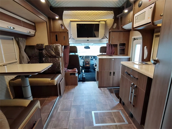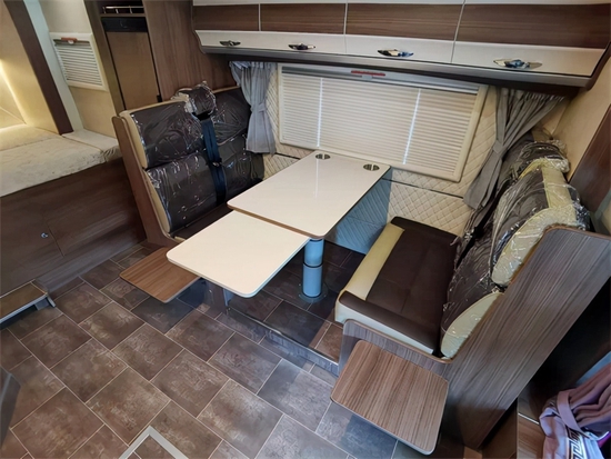 车内部分采用中式的家居风格,更符合中国人的审美,会客厅部分采用的是对座式沙发卡座的设计,直径达到了1.95m做到了行业内最宽,两个成年人面对面坐不会碰到腿。车内储物空间同样十分出色,会客厅上方拥有4组吊柜,后尾部3组,沙发卡座下方同样是储物空间,加上超大的储物仓大概拥有2500L的储物空间可供使用。
