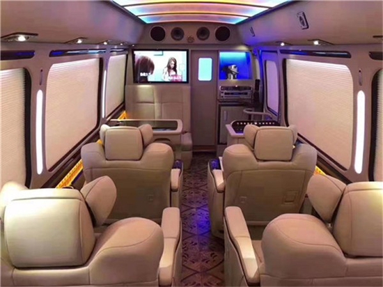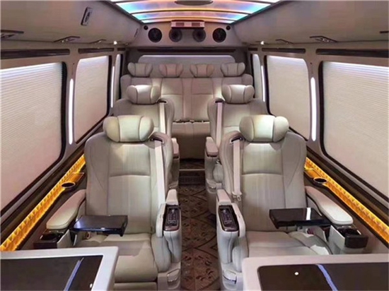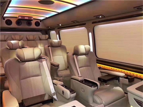 丰田考斯特改装商务车也是充分体现了自己的不同。绿色灯光的宁静,或者是粉色灯光的温馨。豪华A380航空顶灯掌控车内大气格调,LED大灯舒缓眼睛疲劳,给您心灵上的抚慰,窗帘立柱灯提升整体品味或者是通道地毯和蓝色灯光的通道压条的完美统一,办公地带的阅读灯营造温馨舒适环境,地毯的通道压条灯体现高品质高咖位。丰田考斯特改装商务车内饰上的设计都充分体现了作为商务用车的贴心之处。