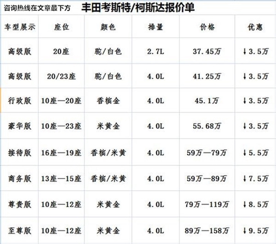丰田柯斯达 (配置|询价)/考斯特【7座】【8座】【9座】【10座】【11座】【12座】【13座】【14座】【15座】【16座】【17座】【18座】【19座】【20座】丰田考斯特是四川一汽生产的一款中巴车,虽然这是一款合资的国产车,但是高配置的优越感绝对不是其他进口车所能企及的。丰田考斯特改装商务车能够受到商务接待以及政府接待用车的青睐,与改装有着不可分割的关系。