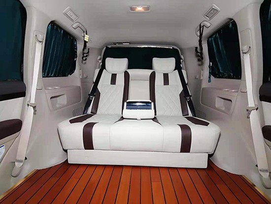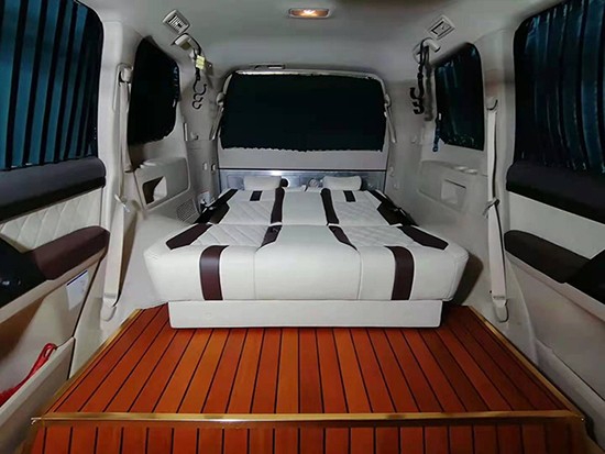 沙发床可以提供三人一起坐,但和原车的一样,三人坐一起会不舒服,两人坐是最好的,腿部空间非常宽阔,一米九的身材在后排腿也能伸展开来,靠背还可以往后180°平躺着,另外座椅也带有前后移动功能,大概前后能移动24公分。