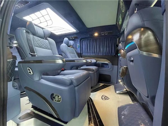 奔驰威霆改装高顶隔断迈巴赫版VS680后排三人连排NAPA真皮包裹座椅,中部配备迈巴赫62S隐藏式功能扶手,触摸液晶显示和储物盒功能,既能够方便乘员放置物品,也可调节车内设备功能,座椅电动调节,前后滑动、背靠倾倒以及放成床,带来更舒适享受。