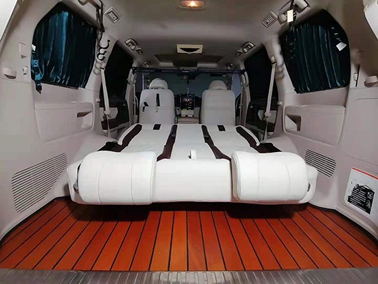 沙发床可以提供三人一起坐,但和原车的一样,三人坐一起会不舒服,两人坐是最好的,腿部空间非常宽阔,一米九的身材在后排腿也能伸展开来,靠背还可以往后180°平躺着,另外座椅也带有前后移动功能,大概前后能移动24公分。