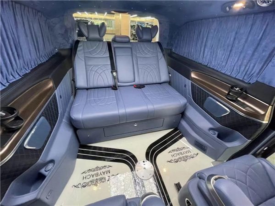 奔驰威霆改装高顶隔断迈巴赫版VS680后排三人连排NAPA真皮包裹座椅,中部配备迈巴赫62S隐藏式功能扶手,触摸液晶显示和储物盒功能,既能够方便乘员放置物品,也可调节车内设备功能,座椅电动调节,前后滑动、背靠倾倒以及平放成床,带来更舒适享受。