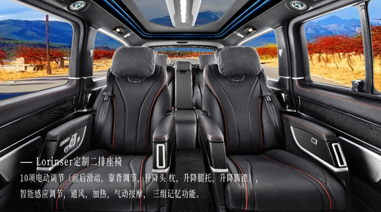 罗伦士将迈巴赫的环抱舱座椅理念嫁接到VS560MX三排座椅上,完全颠覆了商务车座椅理念,在商务车中可以跨界享受到迈巴赫级轿车座椅的舒适度。