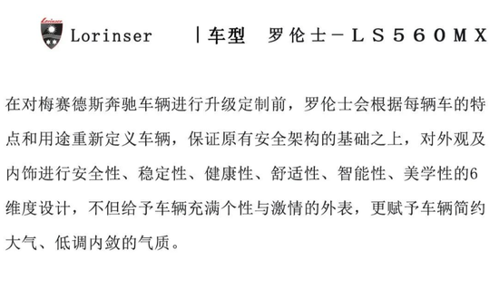 罗伦士的理念是在保证原型车安全结构的基础之上,对其外观及内饰进行全新设计和品质升级,让车辆更加赏心悦目,散发由内而外的安逸。更安全、更稳定、更健康、更舒适,不是每一辆奔驰都叫罗伦士。