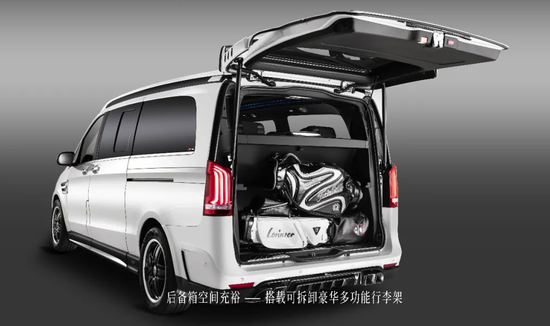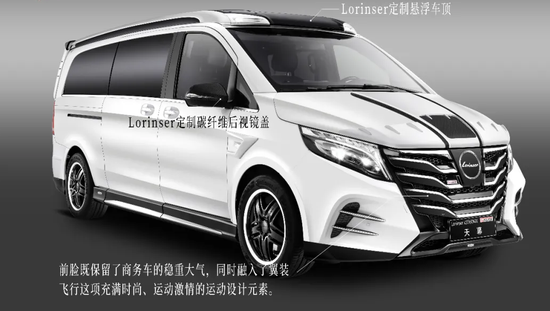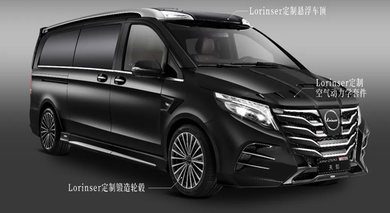 Lorinser定制套件:翼型车体|云层格栅|镀铬套件|悬浮高顶|翼子板套件|四出排气尾喉|侧窗可开启|定制锻造轮毂245/45 R19|尾部扩散气&扰流板|双翼顶灯|碳纤后视镜盖|反射板|运动包围