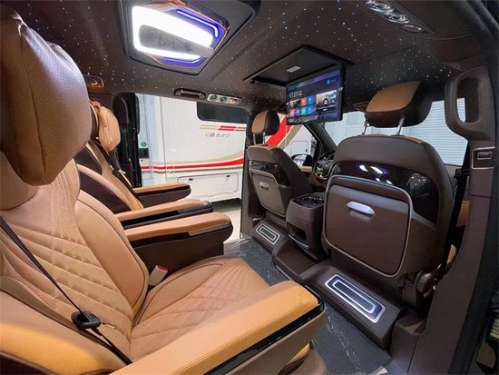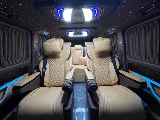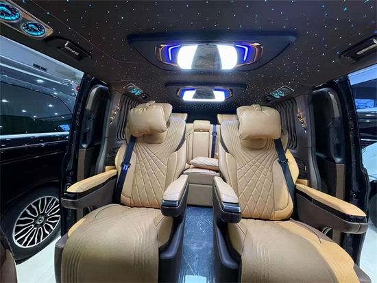 奔驰威霆双门平顶版车顶部分采用成本相当高的头层牛皮包覆,采用迈巴赫Logo光纤可变色顶灯,如果说这种豪华的氛围只是感性上的认知,那用理性的决定选择就体现在它的个性化功能上。第三排座椅为标准的电动沙发座椅,可以通过隐藏在靠背中部扶手上的控制屏对座椅的靠背、腿托进行控制调节,必要时可以完全放平,形成一张豪华双人大床。其绝佳的空间设计,让商务出行更加舒适放松,可调整的座椅设计能根据实际需求灵活改变,满足各种类型的使用需求。
