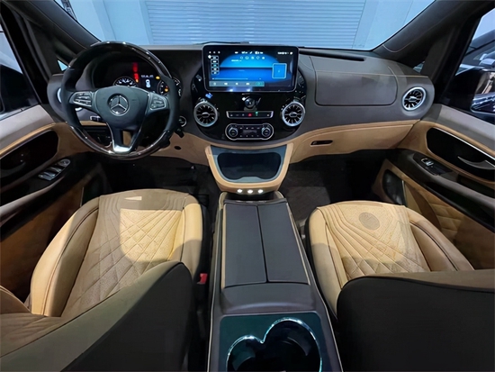 新款奔驰威霆平顶7座商务车采用了全新三幅式设计多功能方向盘,加装nappa真皮包覆,以及大量的高光橡木点缀,全车的座椅和内饰皮革采用的都是进口头层牛皮,保证了隔音性观赏性以及舒适感。中控部分采用奔驰V~Class的悬浮式中控大屏、巴赫钟表、车载冰箱等豪华配置。彰显着其奢华与舒适。133-7022-6676