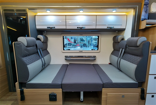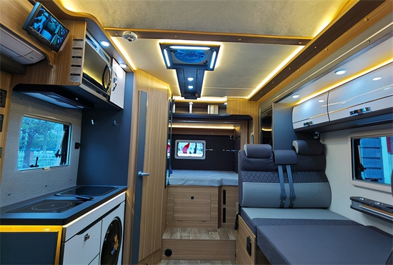 据厂家称,云游双拓展房车内部采用日系房车的设计风格,主要表现为:深灰色沙发包覆面和深灰色家具饰板搭配白两色光源,大部分家具饰面还是以原木风格为主色调。通过相机拍摄到的内饰色差比较明显,实车感觉更漂亮一些。布局方面,前额头床+后横置可拓展床位,中置会客区,中置厨房,后置卫生间。