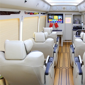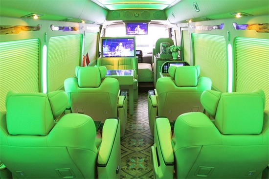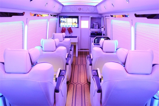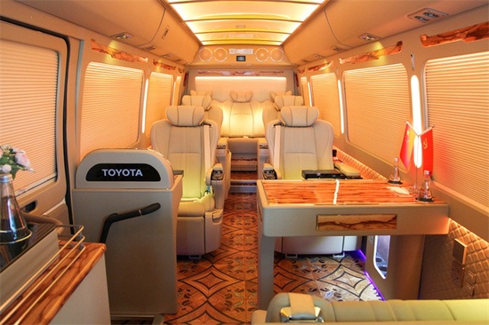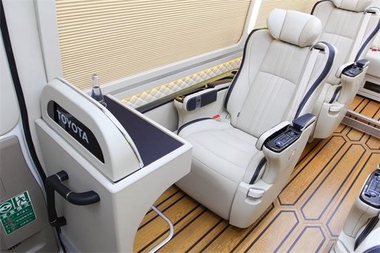 丰田考斯特 (配置|询价)改装商务车内饰航空座椅、真皮座椅以及多媒体系统外加双人办公桌及隔断设计。座椅的设计是为了乘客可以舒适的办公,让乘客办公时不会感到压抑。多媒体及隔断则是是一项最贴心的设计,隔断可以将驾驶舱以及车厢隔开让车厢成为独立的空间;多媒体的存在可以让办公人员在闲时可以看新闻听音乐一些娱乐活动。双人办公可以让商务人士随时随地召开紧急会议。