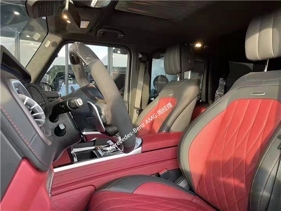 22款奔驰G63狂飙艺术家限量特别版的内饰既豪华又充满科技感,中控台多处均采 用碳纤 维材质覆盖,带彩色TFT显示屏的AMG仪表盘、AMG主菜单和单独 的挡位 显示器以及采用白色照明的AMG门槛。名贵的 选材及精湛的 打造都令 人拍案叫绝。双12.3英寸贯 穿式的显 示屏营造出了浓郁的 科技氛围。当然了,经典的“三把锁”按键自然不会缺席,并且设置 在中控台最为显眼的位置。