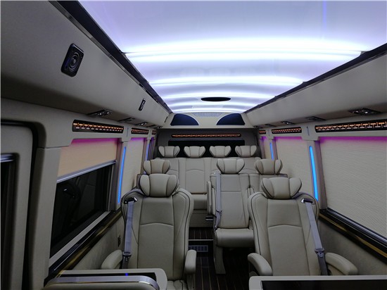 丰田考斯特13座内饰的多媒体设计是让我们在舒适的乘车旅行有更多的轻松时刻的设计,超清的显示屏,吸顶电视,车内的无线网设计以及KTV麦克的充分准备都可以让我们在乘车的过程中享受到游戏的愉快。丰田考斯特13座改装商务车内饰的设计可以让我们的旅途不再是无聊或是疲惫,舒适的座椅贴心的设备让我们随时随地都可以有着属于自己的快乐。