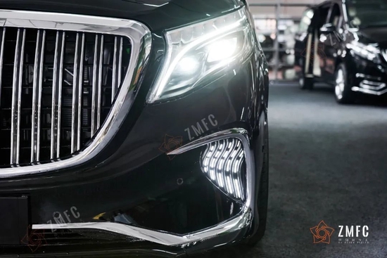奔驰VST780豪华七座商务车的两侧飞翼式LED大灯,以及獠牙式的LED流水雾灯组,给人带来极大的视觉冲击感,完全不逊色AMG包围。
