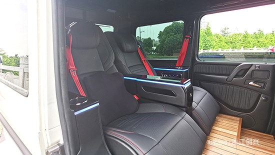 这台17款的G63从原先的五座变成了四座版,四座版的它空间上改变了许多,除了座椅更大外、空间也更大,功能也更多,四座G63它是一台无比运动的车,也是一台舒适度十足的车,后排座椅的两个靠背可以完全往后方平,由于座椅非常宽阔又高又平整,所以打平后就可以当一张床使用。