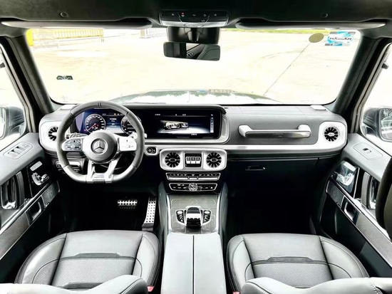 21款奔驰G63的内饰即豪华又充满科技感,中控台多处均采用碳纤维材质覆盖,带彩色TFT显示屏的AMG仪表盘、AMG主菜单和单独的挡位显示器以及采用白色照明的AMG门槛。名贵的选材及精湛的打造都令人拍案叫绝。双12.3英寸贯穿式的显示屏营造出了浓郁的科技氛围。当然了,经典的“三把锁”按键自然不会缺席,并且设置在中控台最为显眼的位置。