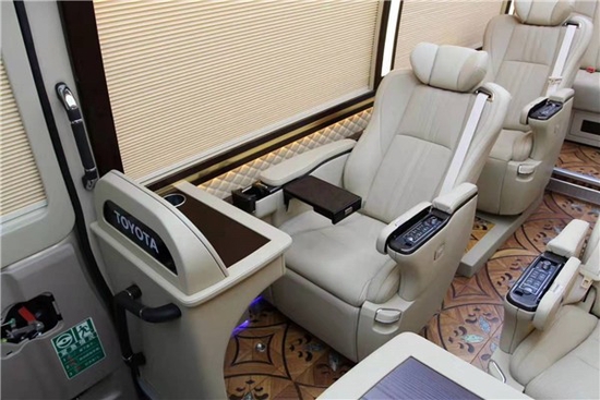 丰田考斯特改装车在窗帘的设计上提供了两种选择,一种是优雅的布艺窗帘,另一类是百褶窗帘,布艺窗帘简单实用,百褶窗帘尊大气,遮光性更好,更可选装电动装置!,丰田考斯特改装商务车内饰的改装上,还有许多不同的细节的设计。