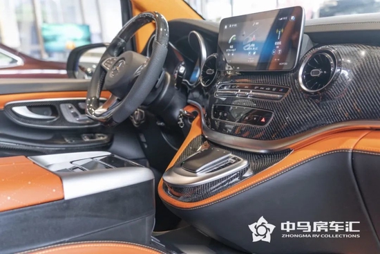 进入2022款奔驰v260高顶商务车的驾驶舱,中控台饰板和方向盘都用碳纤维包覆,看起来非常高级。