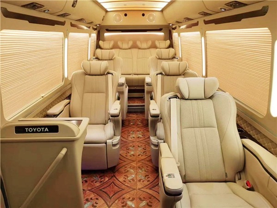 丰田 考斯特12座高端改装商务车更加注重商务旅行中办公的实用性。真皮航空座椅,电动调节装置可以让您自行调节最舒适的空间距离以及靠背以及脚托的角度,特殊的座椅构造,增加腰部的支撑,宽敞的空间让您的双腿收放自如,忘却旅途的紧迫感,体验如家般的感觉,缓解您在行车旅途中的疲劳。