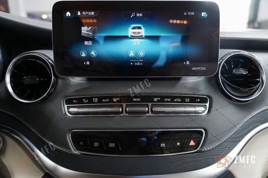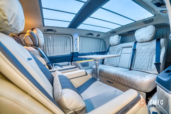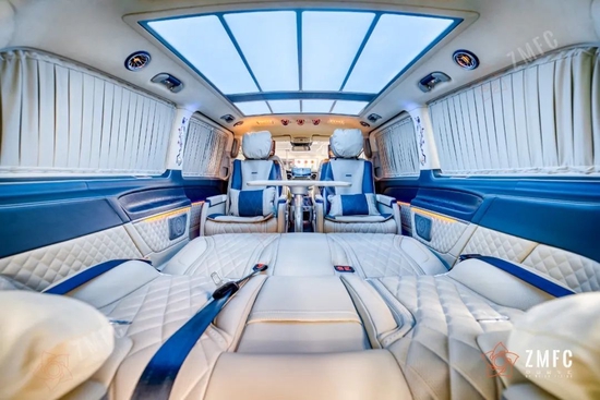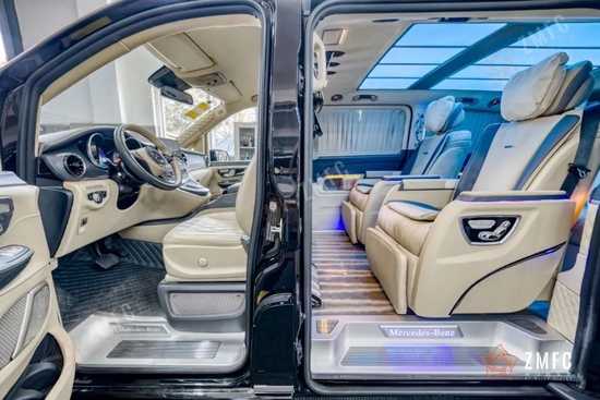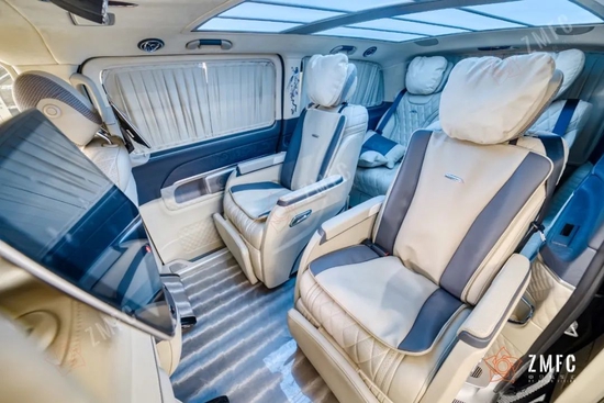 奔驰VST780豪华七座商务车采用意大利进口Alcantara翻毛皮包覆的头等舱,精致缝线的真皮双色航空座椅,九宫格式可变色顶灯,烘托出奢华的车厢氛围。