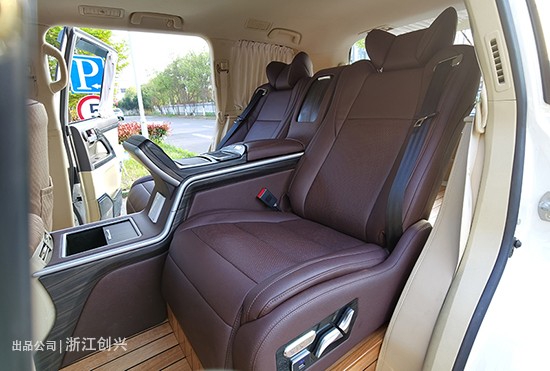 二排航空座椅中间的扶手很长,连接上前排主副驾的原车扶手箱,形成“隔断”,这种风格的扶手叫马鞍扶手,是最近这两年的热门改法,把原来中间的三人座分隔开型成两人座的话其实空间更大,因为原车三人座空间虽然说坐两个人的话空间很大,但两人不好去分配过多的空间就浪费了很多空间,改装后就可以很好的分隔开来。