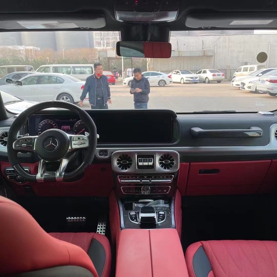 2020款奔驰G63美规 颜色:曜石黑/红(1787)配置:独家内饰包(菱形格座椅,真皮仪表台,座椅按摩通风加热),碳纤维内饰,红色卡钳,碳纤维方向盘,方向盘加热,22寸熏黑轮毂,G级内饰手续齐 价格:325万。