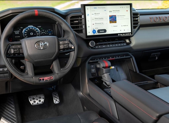 22款丰田坦途TRD集合了SUV的越野性能、卡车的载货能力、以及轿车的舒适性。丰田坦途五个小仪表给出了司机应该注意的技术参数,转速表、时速表、油量表、水温表、电池/机油表依次排列,数据显示清晰明了,中控台科技感十足,三辐方向盘延续了家族设计理念。