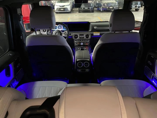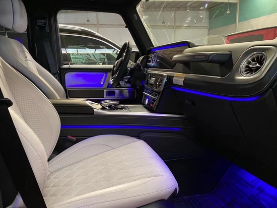 2021款奔驰G63新车内部采用了高档地毯、钢琴黑饰条和皮革座椅营造了一个十分豪华的内饰氛围奔驰G63豪华精致的真皮包覆提供了足够的舒适性和支撑性,通风和加热功能让乘客免受高温和寒冷的煎熬。中控台多处均采用碳纤维材料覆带彩色TFT显示屏的AMG仪表盘、