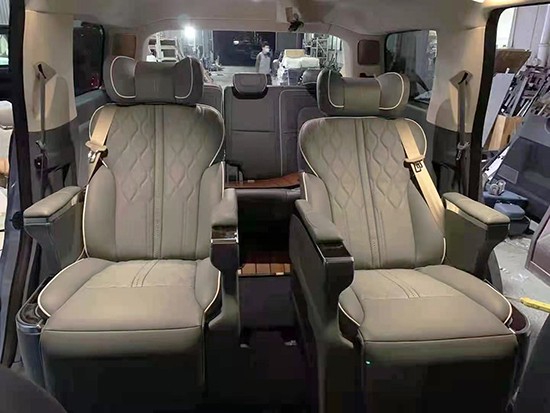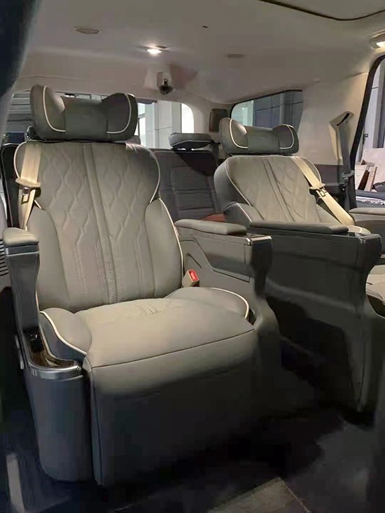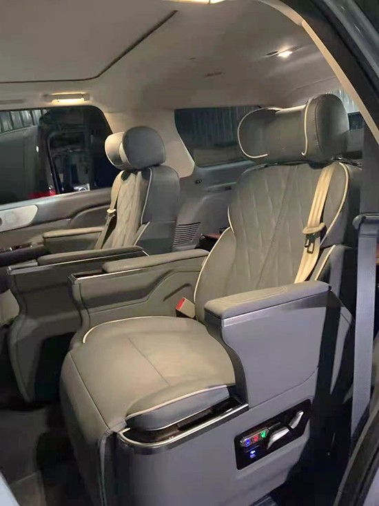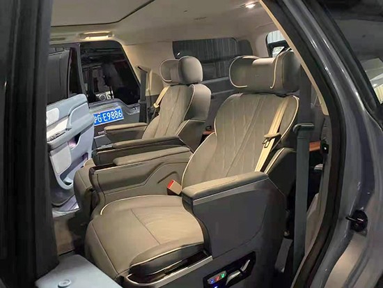原车内饰的中央扶手箱作用不是很大,也不是必要的东西,所以进行了拆除后可以替换成比原来更宽阔的航空座椅,航空座椅全电动控制,带有电动腿托,领航员的空间非常大,可以很好的利用到座椅的腿托,座椅也可以前后移动的,大概24公分左右的移动距离,靠背可以180°打平,在车里边也可以很好的躺下休息,非常的商务化,而且全电动控制。