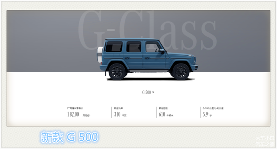 北京奔驰4S店4.0TV8涡轮增压发动机、三把锁、四驱系统、9速变速箱这样的动力配置你能想到什么?没错。这就是来自梅赛德斯-奔驰的新款奔驰G 500车型,目前新车已经正式上市,共有一款车型,官方指导价为184.2万元。
