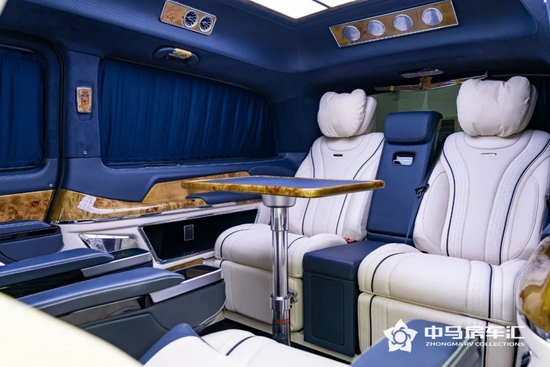 奔驰圣母峰凯旋内舱:羊绒地毯|12项电控航空坐席|会议桌板 品茗茶席|水晶萤石九宫格顶|多色可调环境氛围灯|柏林之声全声道音响|电动窗帘