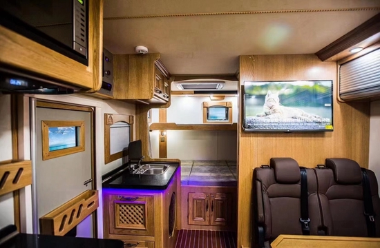 1600AH锂电,400升净水的超大水电系统是长期驻车的保障。自吸水功能可在水源处随意补水,美国红橡实木家具牢固可靠,液压尾架可提升2吨级重物(例如哈雷,宝马ADV等)。安全可靠,美观舒适是我们的设计原则。全国千家服务站是安全用车的保障。