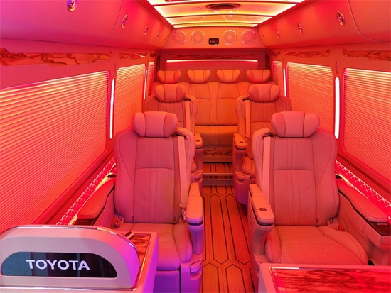 丰田考斯特改装12座商务车在座椅的设计上我们还可以增加自动调节装置。自动调节座椅前后的距离或者靠背的角度,夏日里的通风装置或者冬日里的自动加热设置,我们都可以根据自己的需求进行改装。在其他的一些装饰的改装上,例如窗帘地毯,我们都可以根据自己的需求选择。窗帘的选择上我们可以选择豪华的布艺窗帘,也可以选择舒适的百叶窗帘,百叶窗帘可以选择是手动的还是自动的,加装窗帘装饰框等等,都可以根据我们自己的需要进行选择。