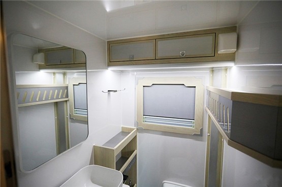 卫生间采用干湿一体式设计,内部配备赛特福德马桶、洗手池、梳妆镜、换气扇、淋浴花洒等;大宇3kg洗衣机免去了手洗的时间,提高了生活效率;水路系统方面,400升净水箱、75升灰水箱。整车上下水系统做了防冻处理,更好的适应极度严寒等恶劣环境。