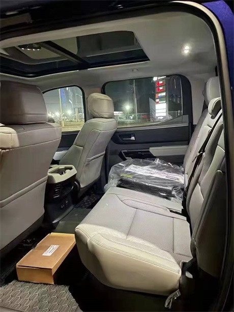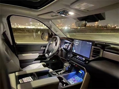 22款丰田坦途座椅提供有皮质包裹,整体的造型也非常宽大,在中央扶手区域的设计上也采用了非常方正的造型设计,并且可以看到前排的储物空间设计还是非常丰富的。