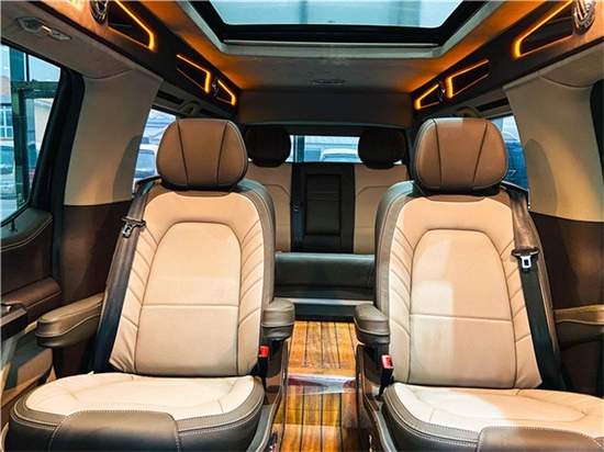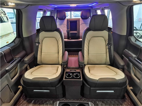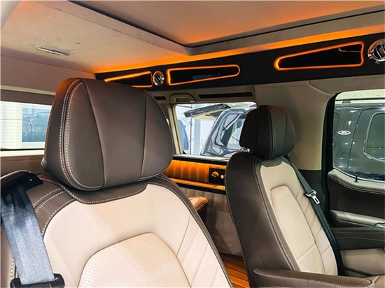 福特F150猛禽改装六座SUV内饰方面,配备标准独特的皮革和布艺装饰的座椅,驾驶员侧的电动十向调节,同时具备记忆功能,中央控制区搭配了触控式显示屏,其下方则是多媒体控制区及空调面板,采用旋钮+物理按键的组合。中控功能区域可分为三个小控制区,最上端为音响控制及导航控制,中间为收音机调节控制,最低端为空调及座椅加热控制。
