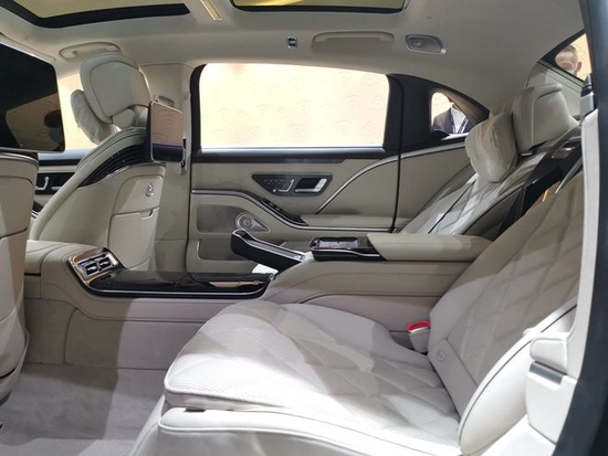 尺寸方面,迈巴赫S580 4MATIC长宽高为:5470/1921/1510mm,轴距为3396mm,定位大型车范畴。现场展车是四座版本,后排配备有中央扶手、多媒体大屏、腿托等设计。当副驾驶位通过按钮放倒以后,右后方的乘客伸直双腿都没有问题。