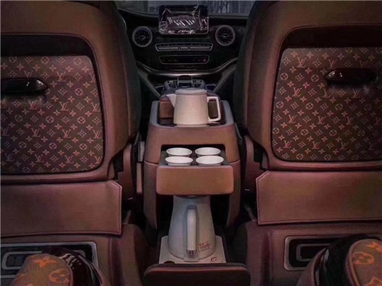 内饰以精致岑木加持真皮包裹,展现每一角落的美好瞬间。车顶以高端麂皮绒材质包裹,烘托出精致而美轮美奂的视觉享受,以LV定制设计配饰,将奢侈品的追求融入到每一次的驾驶之中。LV定制版车顶灯,多种灯光模式柔和光线烘托之下,渲染出最随和心意的驾驶氛围。扶手处收纳式小桌板,搁置精美茶具套组,承载浓醇甘厚茶味,品味一路出行的美妙体验。