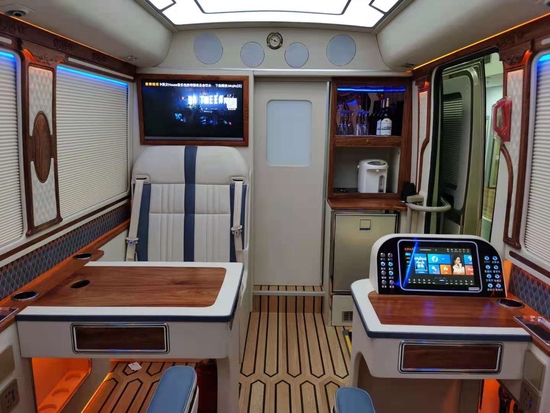 装备了全红木的办公桌、全红木助理桌、220V电源、阅读灯、无线网络等满足绝大多数的办公场景。娱乐系统,宇通T7搭配卡拉ok点歌系统、整车氛围灯、影音系统、助理控制台等功能为乘车过程娱乐活动提供了无限可能。
