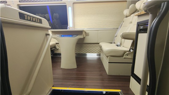 改装是为了更加美观更加舒适或者更能彰显一种尊贵的身份。丰田考斯特在内饰的改装上更加注重尊贵的衬托,高档的豪华座椅暂且不说,自动调节的百叶窗帘也无需再提,就拿车载的影音系统来说,我们完全可以依靠自己的需要设计符合我们需要的车载影音系统,高清的显示屏,专用的麦克以及高级的扬声器设备,随时随地带给乘车人员一种舒适的享受。