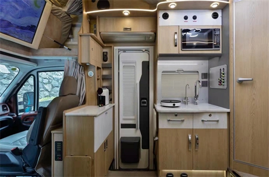 驾驶室同会客区之间由储物隔断隔开,台面可放置储存一些物品,台面的下方也可储物。这款E途Pro Max是支持智能遥控的,通过房车智能APP,可对车内的电器进行远程遥控,在房车中实现了智能家居。会客区为双人对坐沙发座椅+升降桌的经典组合设计,座椅采用的是NAPPA真皮包裹,可实现沙发拼床,沙发的下面设计了储物格,可以储藏物品。