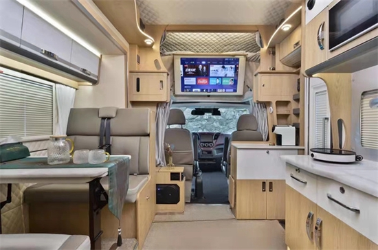 生活区由前向后分别是额头床、会客区、厨房区、卫生间和车尾床。车内依旧延续了E途系列深色木纹轻量化环保板材、颇有格调的小吊顶设计、车顶中央那个颇具设计感的小吊灯等特点,豪华氛围营造的不错。空间方面,车厢内高2.12米,横向空间在侧拓展舱的加持下,完全不用担心。