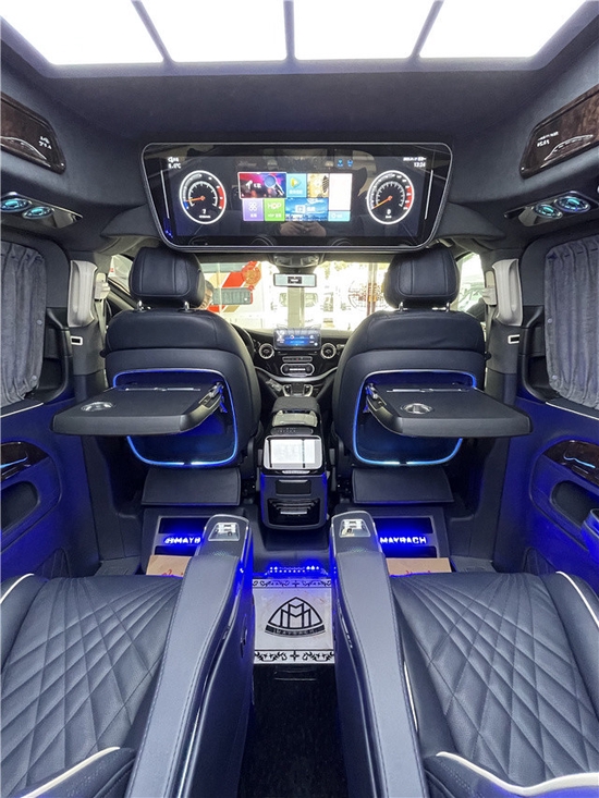 奔驰威霆巴赫版拥有绝佳的空间设计,让商务出行更加舒适放松,可调整的座椅设计能根据实际需求灵活改变,满足各种类型的使用要求。全车尺寸:5370*1928*2080mm,轴距为3430mm完美保证了车内空间也造就了非同一般的外观。动力方面:奔驰威霆搭载代号为M274的2.0T发动机,4缸211马力,最大功率为155KW,峰值扭矩为350Nm,全系匹配9速自动变速器。这款采用海洋蓝色调搭配,车厢内侧采用全真皮包覆,整车内饰选用优质材料,豪华的同时也非常舒适。