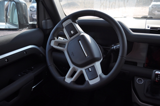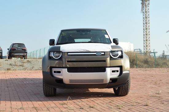 20款路虎全新卫士新车车头依旧使用了方方正正的设计元素,方形前灯组内有半圆形光源,前进气格栅的造型设计十分简洁并带有经典的“LAND ROVER”绿色logo,前机盖边缘的“DEFENDER”车型标识也得到了保留。前保险杠下部带有大面积的银色护板,整个前脸的层次感分明,也显得非常厚重。