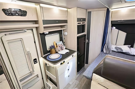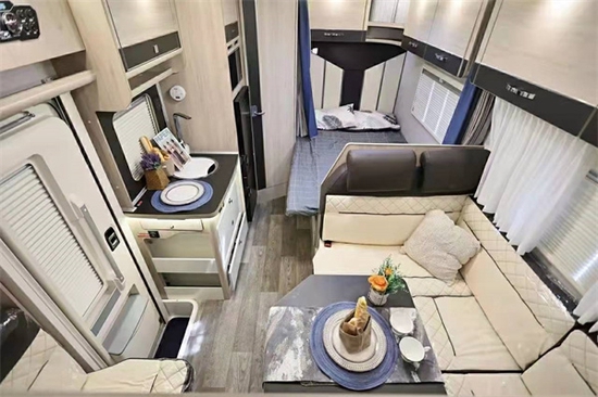 纪念版Y9在箱体上做了加宽处理,使内径宽达到了2.3米,同级产品中最大。所以,虽然Y9是不拓展车型,但是内部空间却不拥挤。内饰布局上,从前到后依次是驾驶区、会客区、厨房区、卫生间区和休息区。会客区设计了L型沙发卡座,可升降餐桌,驻车休息时,可以将升降桌放下,形成一个单人床。在沙发卡座的对面,设计了一个单人小沙发,与会客厅形成了闭环。额头床依旧是2300*1400mm的尺寸,带爬梯,可方便上下床。