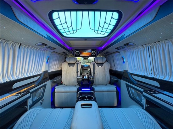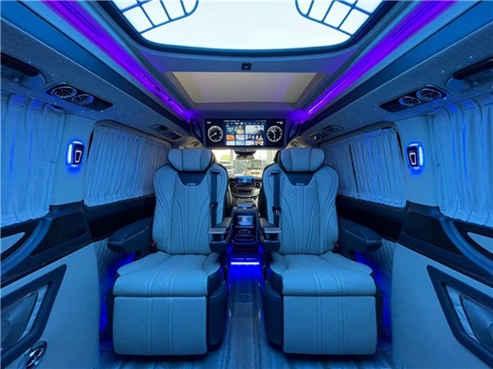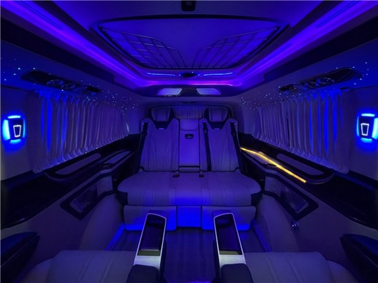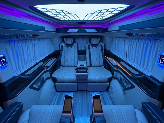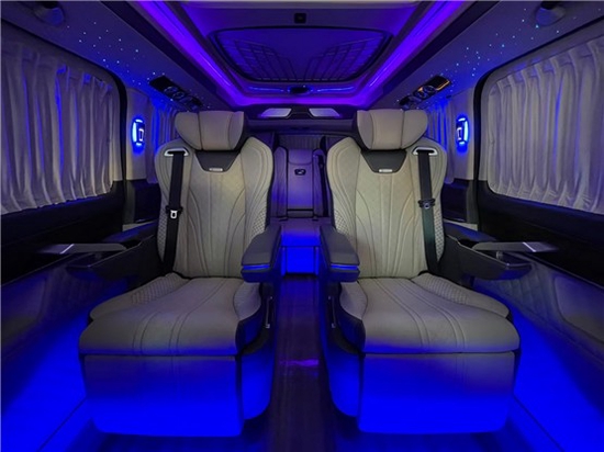 2021款奔驰V260L改装商务车第二排航空座椅为带电动、加热、按摩、通风功能的航空级首长席,可沿着地面上滑轨实现一键电动式前后滑动,对于这种智能化的乘坐体验,是原厂车型笨拙的手动拖拽模式所望尘莫及的。车内的氛围灯打开后,奔驰V260内舱变得灵活多变,气氛也可以根据主灯颜色变换而变化,主要的乘坐座椅配置的独立的按摩功能,通风加热,一体腿托,功能丰富,乘坐舒适,是商务接待用车的代步良品。